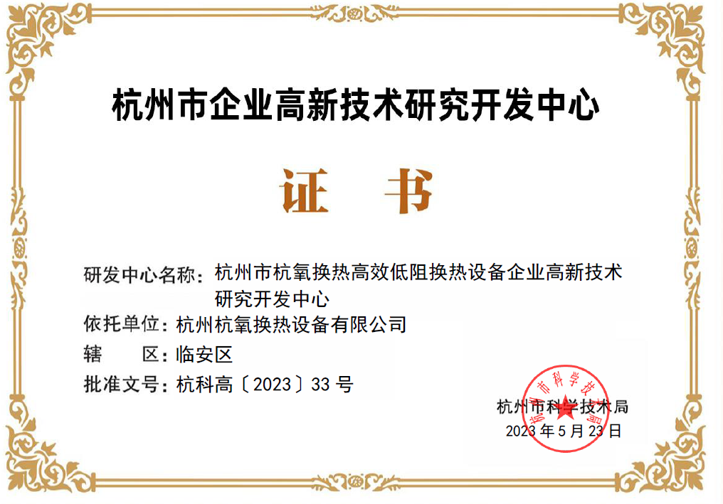 2023年2月10日《杭州市企業(yè)高新技術研究開發(fā)中心管理辦法》及杭州市科技局統(tǒng)籌部署決定組織開展2023年杭州市高新技術研究開發(fā)中心申報工作,我們杭氧換熱設備有限公司滿足了申報條件并進行了申報。